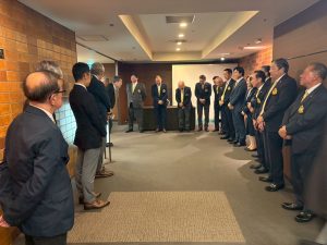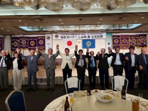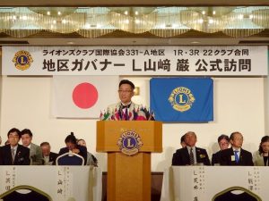 山﨑地区ガバナーより基本方針、今期の目標についてお話、各クラブとのバナー、バッジ交換を行いました。